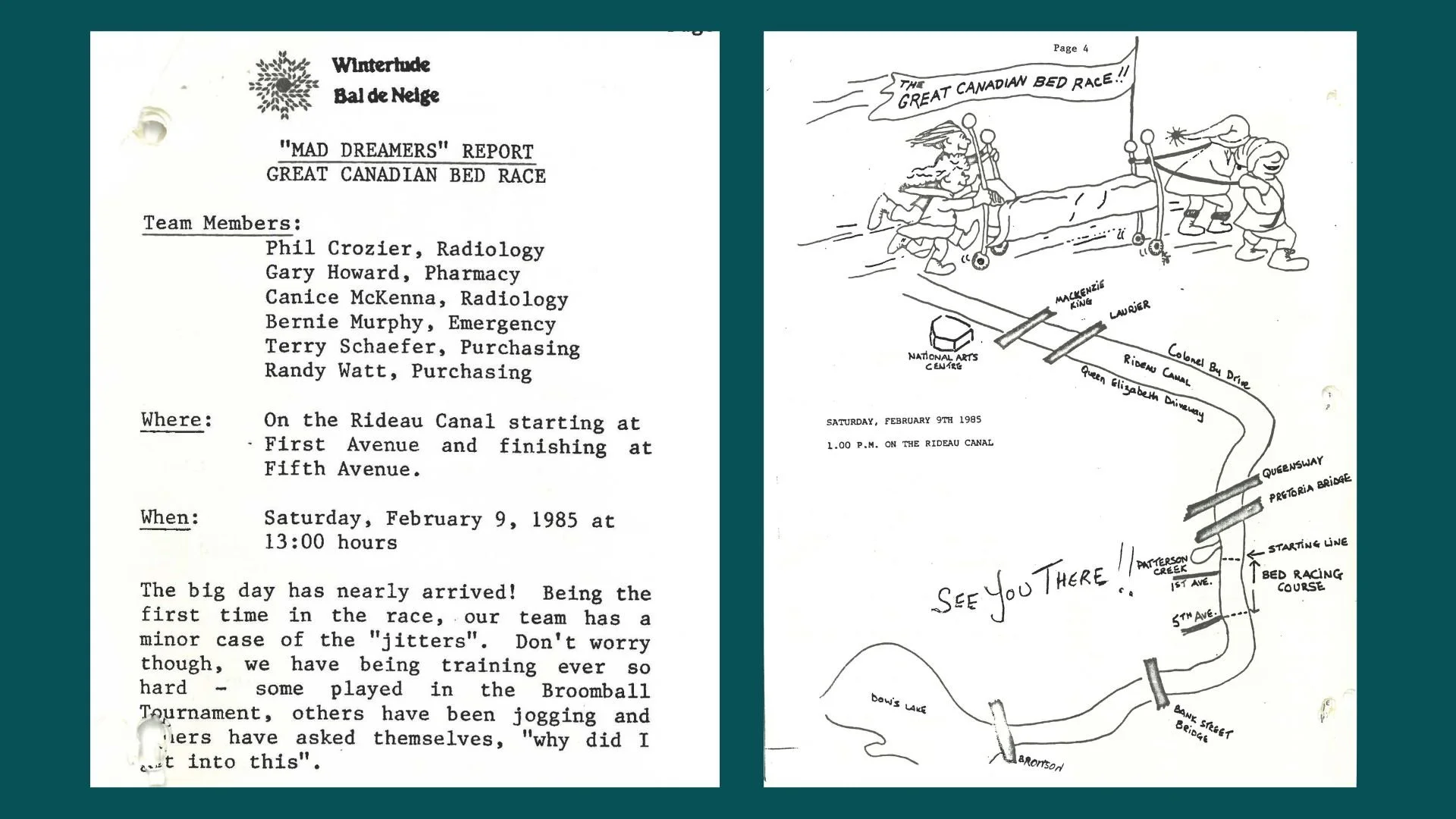 In 1985, the QCH “Mad Dreamers” joined the annual Winterlude bed race, competing in the Hospital Heat, a friendly competition between local hospitals in the Great Canadian Bed Race. By then, the race had been running for seven years and was a core part of Ottawa’s Winterlude festivities. Held on the Rideau Canal, the event followed strict rules for bed design and safety to keep the race fun and fair.