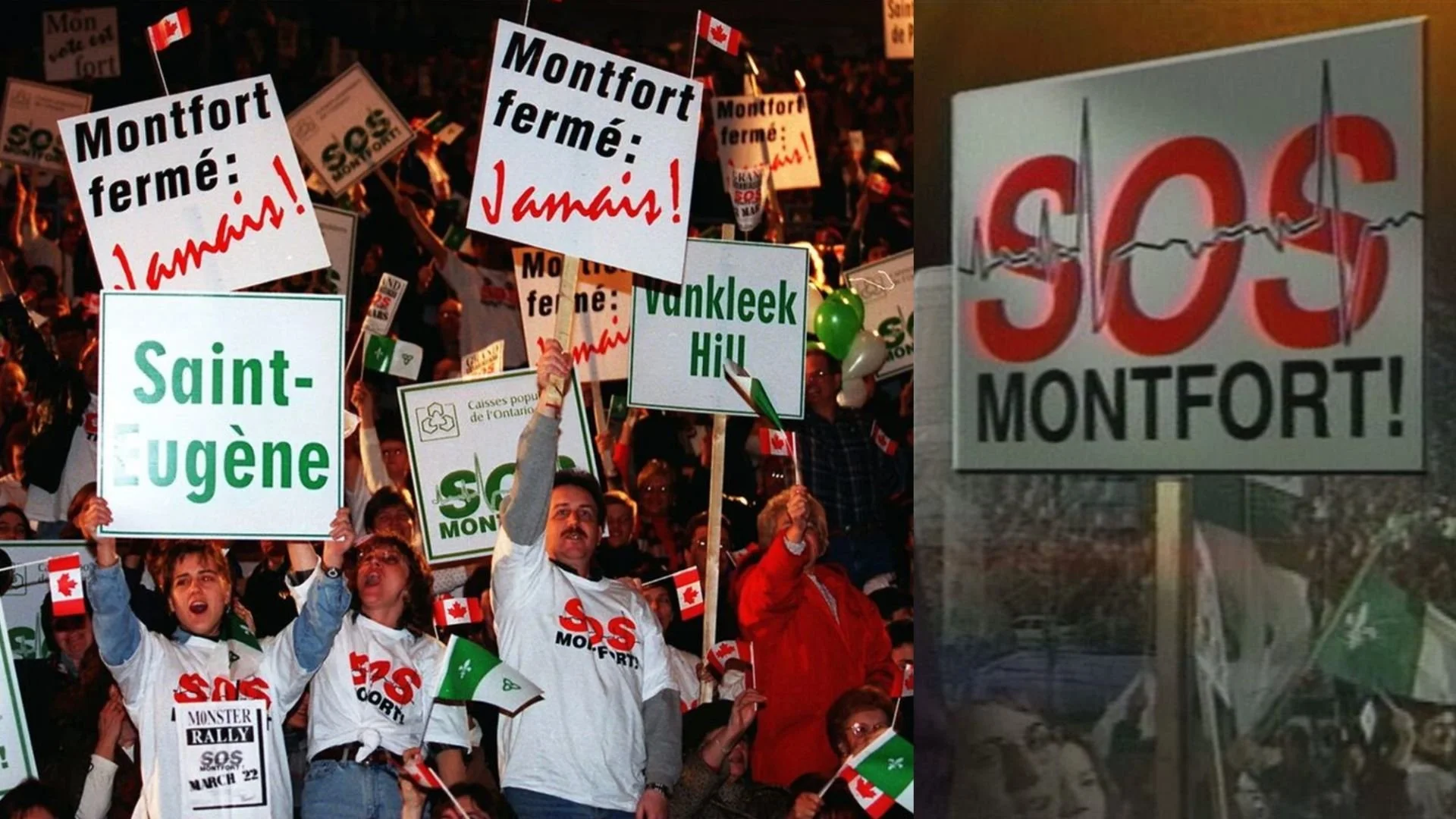 The 1977 March rally at the Ottawa Civic Centre to save Montfort Hospital from closure. Amidst the hospital restructuring in the region, Montfort Hospital started the “SOS Montfort” campaign to save its hospital. Montfort along with the Grace Hospital were on the list for potential hospital closures in the region.